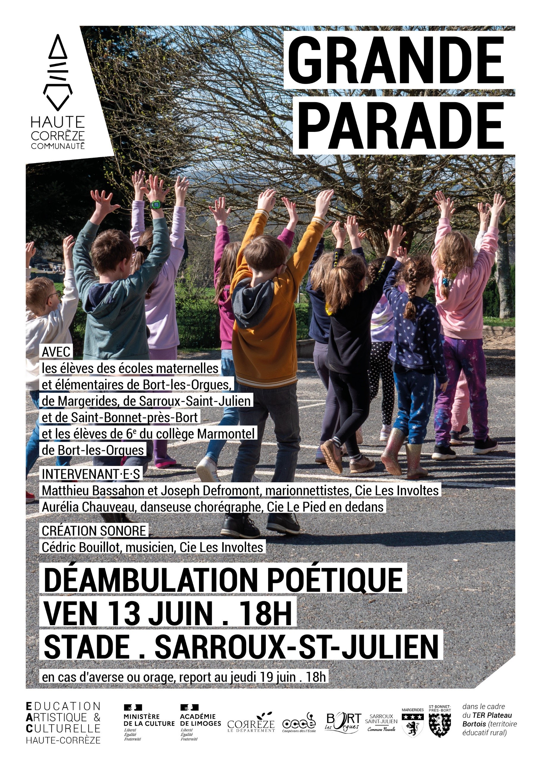 Ce projet « Grande Parade » a reçu le précieux soutien de la DRAC Nouvelle-Aquitaine, du Rectorat de Limoges, du Département de la Corrèze, de Haute-Corrèze Communauté, de l’OCCE19, du TER Plateau Bortois, des communes de Bort-les-Orgues, Margerides, Saint-Bonnet-près-Bort et Sarroux-Saint-Julien avec l’implication enthousiaste des équipes artistiques, du collège et des écoles et de leurs équipes pédagogiques. Un immense merci à tous ces acteurs !