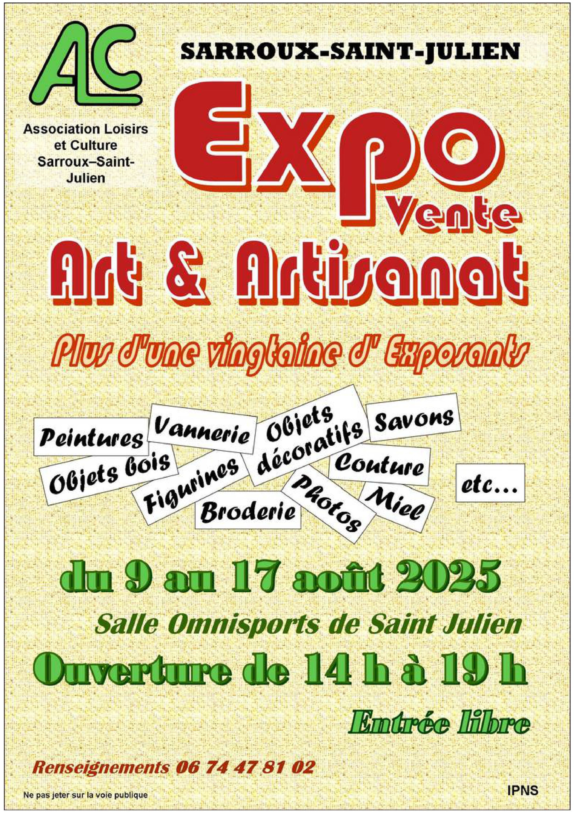 L’Association Loisirs et Culture (ALC) propose sa 9 e exposition Art et Artisanat à la salle omnisports de Saint-Julien-près-Bort, du 9 au 17 août. 2025.