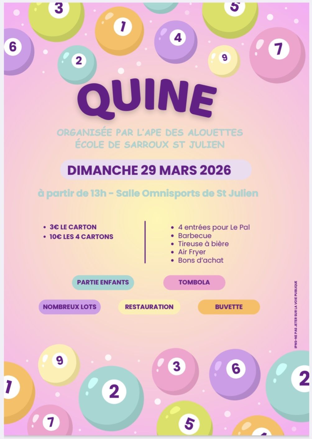 Rendez-vous le dimanche 29 mars 2026 à la salle Omnisports de St Julien pour notre traditionnelle quine ! Ouverture des portes à 13h, début du loto à 14h. Venez nombreux