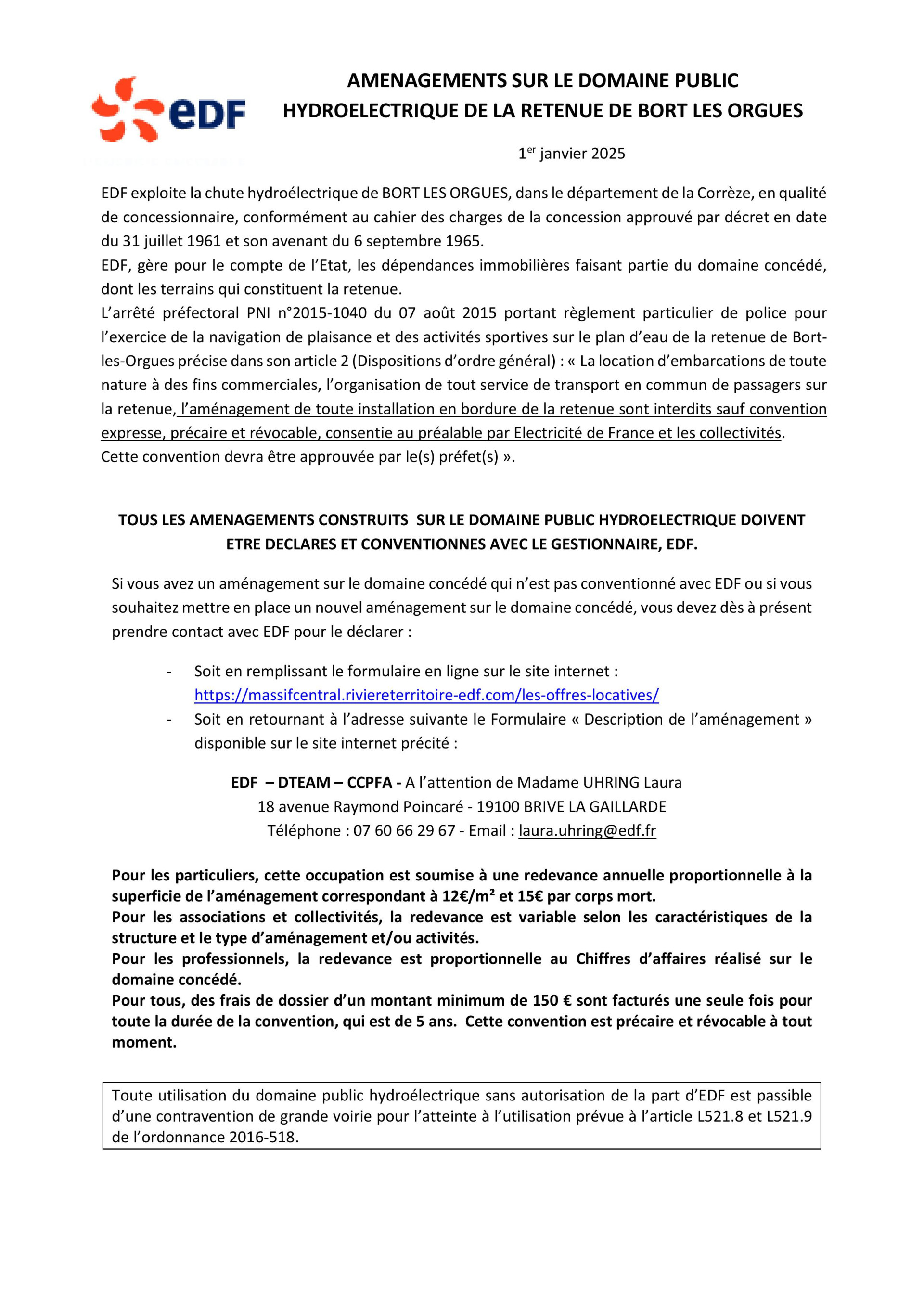 Occupation du domaine concédé à EDF ou réalisation d'une activité sur le domaine concédé à EDF