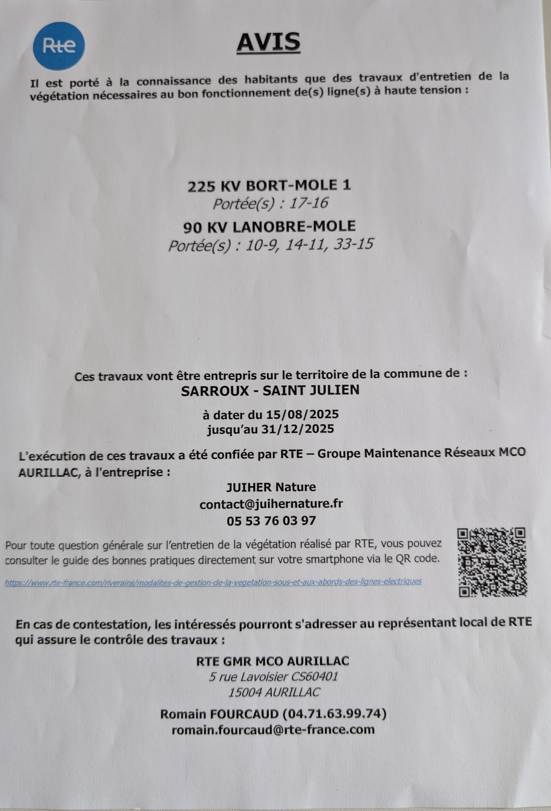 Des travaux d'entretien des lignes très haute tension auront lieu entre le 15/08 et le 31/12/2025 sur le territoire de la commune de Sarroux-Saint Julien.